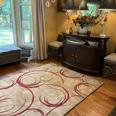 Awesome area rug for our living room. The colors match perfectly with our cherry hardwood floor. Rug feels and looks of quality. Very satisfied with the purchase. Many compliments on the design and colors. Rug was delivered rolled tight in heavy plastic outer covering. Easy to open and spread on the floor with very small crease on end to straighten out.
