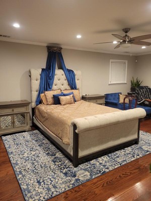 This is such a beautiful rug. It is the perfect size for an 80" dining table with plenty of room for chairs to move without falling off the edges. The description doesn't tell you about the almost unseen gray areas that blend so nicely and the soft cushion. Perfect for my newly painted gray walls and my blue accent pieces in my dining room!
