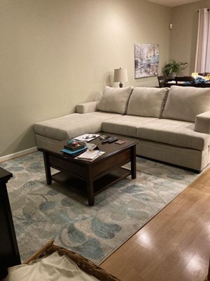 [This review was collected as part of a promotion.] First off, the blue really brightens up the room. I like the relaxing color and not overly busy design pattern. I'm not into the flowery or too colorful designs I see in a lot of area rugs. This one works well, and covers a nice 5'x7' area—almost exactly the length of my sofa on the long end and the length of my loveseat on the other, with a coffee table in the middle. Perfect!