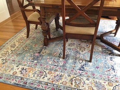 This rug is much more colorful than the picture on the website. It is thin, but I put a pad under it and it’s fine. It makes the table stand out and brightens up the dining room. Very happy with this choice.