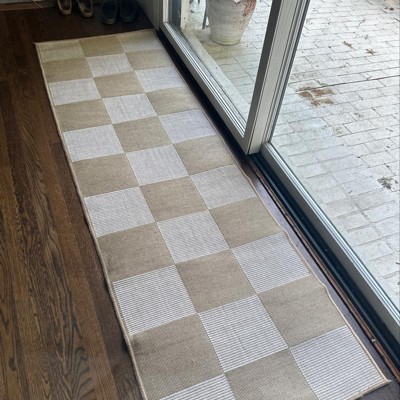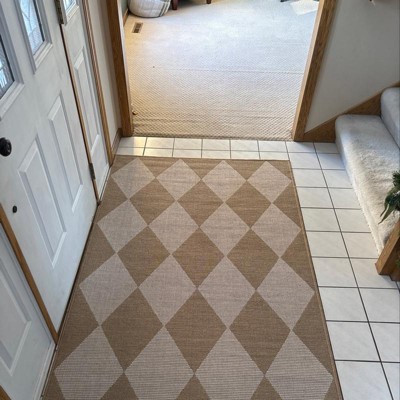 Do not sleep on buying this rug! It is SUCH a great value. Very high-end diamond pattern design, but at a great price point. It feels like thin jute material (so is not soft), but looks beautiful indoors and serves its purpose aesthetically. Little jute smell that will air out and improve with time. Gives major Studio McGee vibes and looks amazing as a neutral rug to place in a space with colored walls.