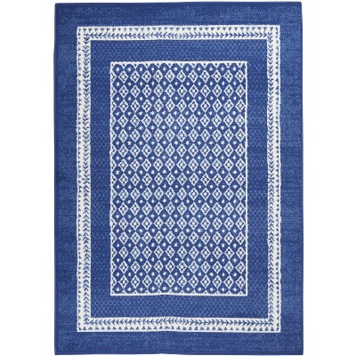 Create a base for your carefree lifestyle with this boho-chic area rug from the Whimsicle Collection. Classic globally inspired motifs in space dyed ivory are woven onto a navy-blue ground for a distinctly vintage look in your living room, bedroom, hallway, or home office. This versatile, low profile design is machine made of soft, easy to clean polyester fibers.