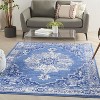 Rustic meets chic in this transitional area rug from the Whimsicle Collection. Inspired by 17th century Persian artistry, scrolling florals surround a classic center medallion design. On-trend navy blue and ivory tones are a versatile complement to French country, boho chic, and farmhouse styles of décor. This low-profile design is machine made of soft, easy to clean polyester fibers.
