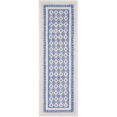 With its simple geometric patterns and double border, this Whimsicle Collection area rug brings an eclectic vibe to your surroundings. A neutral palette of ivory, blue, and grey with distressed accents add a softly antiquated finish to bohemian decor. Machine made of soft polyester with a low profile for a seamless fit under your sofa, dining room table, or near areas that need door clearance.