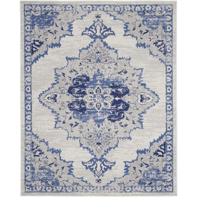 The basis for a Zen-like living space begins with this boho area rug from the Whimsicle Collection. Purposefully distressed geometric patterns in blue and grey woven onto a base of neutral ivory create a warm and inviting feel in your living room, bedroom, dining room, or home office. This global-inspired design is machine made of low profile, easy to clean polyester.