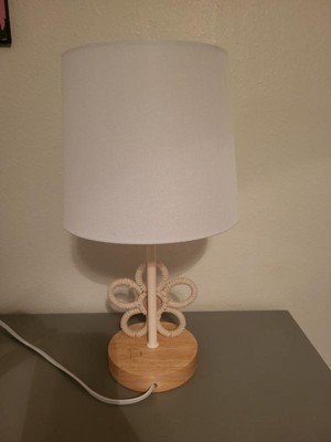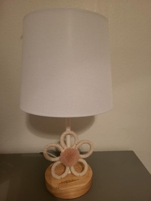 This is a really cute lamp that we added to our shared girls bedroom. It's a great size for a kids room and I like that the switch is just the push kind and not the twisting switch some lamps have, makes it much easier for kids to use! I love the textures on the flower with the rope wrapped around the petals and the fuzzy pink center. I also really like the wooden base. The colors are very soft and neutral enough that it can go with a lot of decor.