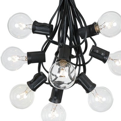 Novelty Lights G40 globe string light set on commercial grade wire with 25 bulbs, perfect for outdoor patios, decks, special event or christmas lighting. Each set includes 25 round bulbs on a 20 gauge SPT-1 wire stringer with 25 sockets that are spaced 12" apart. These globe shape G40 light strings have long lasting 3,000 hour incandescent vintage filament light bulbs. These durable and heavy duty light strings will provide you with years of maintenance free use. Each bulb is 2" wide by 2-7/8" tall and roughly about the size of a racquet ball. Connect 3 sets end-to-end for a total of 75' on one plug. Indoor and outdoor rated.