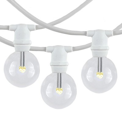 Novelty Lights G30 candelabra base bulbs string light set with 100 bulbs on 100' of commerical grade SPT-2 16 AWG wire. These are our most durable string light sets and are suitable for year round outdoor use and permanent lighting applications. Each set includes 100 G30 candelabra base bulbs on a commerical grade wire stringer with 100 sockets that are spaced 12" apart. These G30 light strings have long-lasting bulbs and are on a heavy duty 16 gauge SPT-2 wire stringer. Each socket is made with PVC plastic to provide a water-tight seal and to ensure no defects due to weather. These durable and heavy duty light strings will provide you with years of maintenance free use. Perfect to use on any patio, restaurant, backyard, pergola, wedding venue, or town square for hanging outdoor string lights.