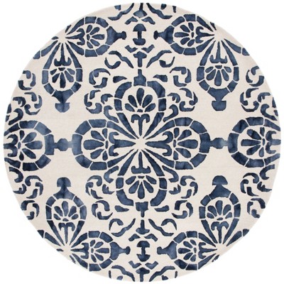 Transform your living space with our beautifully crafted area rug, measuring 7 feet by 7 feet. This round masterpiece, with a height of 3/8 inch, is an artful blend of blue and pink, evoking a sense of serene elegance. The hand tufted wool construction hails from India and is sure to add an exquisite touch to your decor.