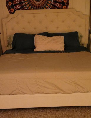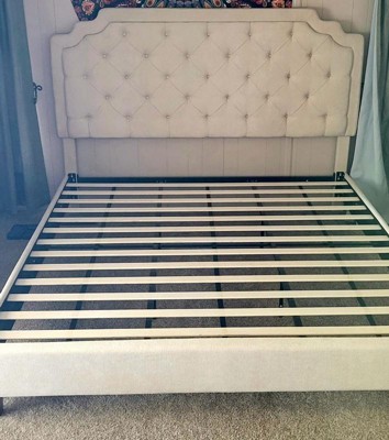 [This review was collected as part of a promotion.] This platform bed frame is the height of luxury. The extra-tall headboard is so soft and cushioned, perfect for sitting up reading or watching tv. The frame itself is solid, fits together perfectly, and the instructions to put it together were straightforward and not difficult to follow. It took a little over an hour to assemble At nearly 120 lbs, it is quite heavy because of the quality materials used, and will last a long time. I will say that although the tufted button details on the headboard look classy, they probably are not the best for households with cats because the soft fabric upholstery is too tempting for them to use as a scratching post, and the button details will inevitably become fur catch and be difficult to clean, especially on the ivory color. However, the workmanship is exquisite, and it is a good solid frame that adds a touch of class to any bedroom.