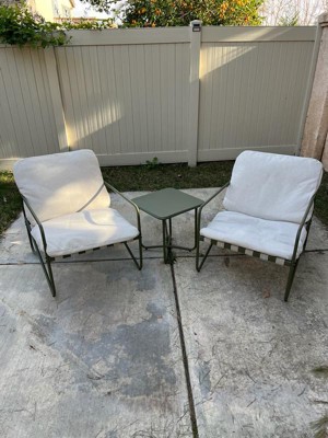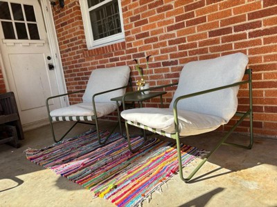 [This review was collected as part of a promotion.] Pros: Very nicely made, classic design, easy to assemble. Seems durable. Cons: Sits VERY low to the ground. Between being 50 and working in vet med, my back hurts most of the time and these chairs are not helping. The cushions are not thick enough, so you feel the straps. The arms are just thin round metal, so it’s uncomfortable to use. I think they would also get very hot here in the Texas summers. This is a very nice patio set, I think would be great for someone younger, and it’s not very easy to get in and out of because it sits too low. If it were 4-5 inches taller, or many had thicker cushions to lift you up higher (put both on one chair and it felt sooo much better!) it would be perfect.