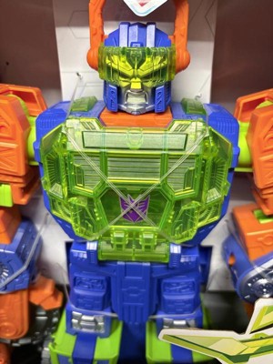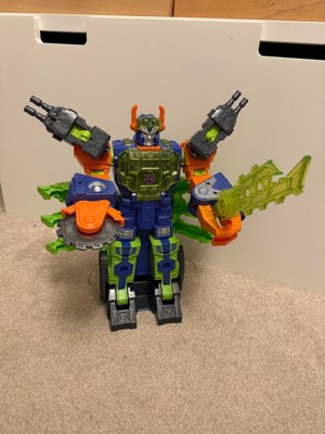 - INTERACTIVE BATTLE FEATURES: The Transformers figure has a spinning buzzsaw blade arm, a working claw arm, and fold-out battle stations in his chest and legs for Cyber Changers figures