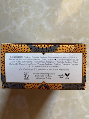 sodium palmate, sodium palm kernelate, water, glycerin, fragrance (parfum), butyrospermum parkii (shea) butter*♥︎, sodium gluconate, sodium shea butterate, sodium chloride, carbon, palm acid, colloidal oatmeal, palm kernel acid, tocopheryl acetate, theobroma cacao cocoa) pod ash, sodium cocoate, aloe barbadensis leaf juice, maltodextrin *certified organic ingredient. ♥︎fair trade ingredient' '