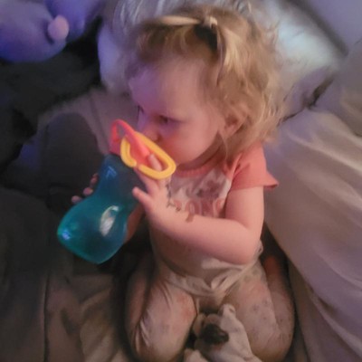 I got this last week as we are trying to switch my granddaughter from the bottle to cups. She is special needs and very picky about everything. She is actually trying to use this cup. This is the first one she would even use. So I will be getting more. The only suggestion is instead of a carabiner, give a latch that opens and closes.