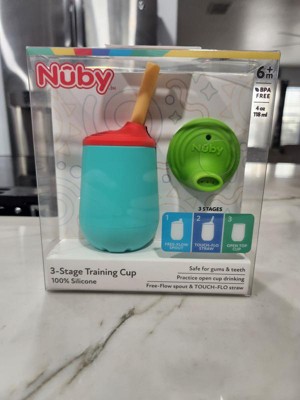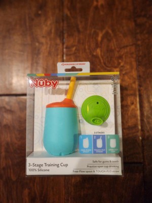 Nuby’s 3-Stage Training Cup Set helps little ones learn to leave the bottle behind and take those first steps toward drinking like a big kid. The 3-Stage Training Cup Set comes complete with a Free-Flow spout top and a No-Spill Touch-Flo straw top, letting your child seamlessly transition to the next step of sipping when they’re ready. When your little one has gotten the hang of self-led sipping, remove the top and use the training cup as an open cup! The cup walls are angled, creating a steady flow and making your child's sips natural, easy, and safe. The 100% silicone cup set is gentle on gums and teeth and features an Easy Grip, non-slip design that is easy for little hands to grasp and hold. The 3-Stage Training Cup Set holds 4 ounces (118 ml) of liquid, perfect for beginners practicing open cup sipping for the first time. Get ready for steady big kid sipping with Nuby's 3-Stage Training Cup Set!