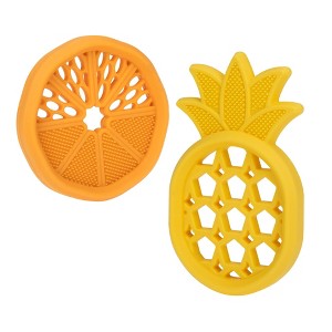 Teething is the pits, but with Nuby's Gum Massaging Silicone Teethers for babies, it doesn't have to be. Our orange- and pineapple-shaped infant teething toys are fun and interactive teethers that help to soothe your baby's uncomfortable gums. This Nuby teether is made of 100% soft silicone for sensitive, tender mouths, and provides teething relief without being rough on delicate gums. The bright colors, fun shapes, and interesting textures appeal to your little one's sense of sight and touch. Toss this baby essential in your baby's diaper bag or stroller so you always have teething relief on the go. At Nuby, our goal is to help make the teething process just a little easier for you and your little one!