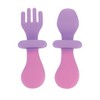Nuby’s First Fork and Spoon with Safety Guards make introducing baby to self-feeding a breeze! Made with soft silicone, this fork and spoon set is gentle on baby’s gums and teeth. The utensils’ wide, short handles are easy for little ones to grasp and hold as they build hand strength and dexterity. The First Fork and Spoon feature built-in safety guards, which helps prevent little ones from choking on the utensils while they eat. The First Fork and Spoon set helps little ones develop the fine motor skills needed to feed themselves and help to encourage good eating habits. Nuby always keeps quality in mind, which is why the First Fork and Spoon set is made of durable materials.