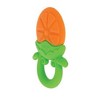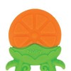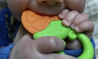 This orange slice teether is ideal for tender-gummed teething babies. The Nuby Fruity Chews Teether is made of soft silicone that soothes sensitive gums as babies teethe. It is designed with textured teething surfaces that gently massage and stimulate baby's gums. Each teether is designed with small openings that are easy for little ones to grasp and hold. The ultra-flexible silicone is twistable, squeezable, and tuggable. Little hands will build hand strength and develop motor skills as they tug and twist the silicone teether. The bright color and fun shape of the teether will catch your little one’s eye, keeping them engaged and entertained.