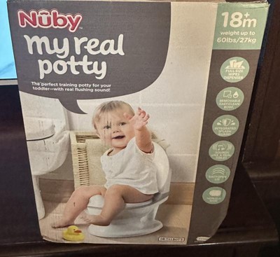 Potty training can be intimidating for your little one. Nuby's My Real Potty helps make the experience relaxed and fun for parent and child. The My Real Potty design mirrors full-size toilets, which help children transition to a real toilet when they are ready. Realistic flushing sounds are fun and engaging, making the learning process easier for children. Cleanup is easy for parents, thanks to the removable bowl. Get started on potty training with your little one today!