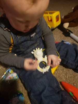 [This review was collected as part of a promotion.] This adorable Jackie the Giraffe Teething Ring by Dr. Talbots is just perfect. The ring is small enough for my granddaughter’s tiny hand. It’s made of a soft rubber that helps soothe her aching gums. The different textures makes it more stimulating. Not only is it functional but it is so cute!