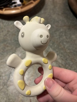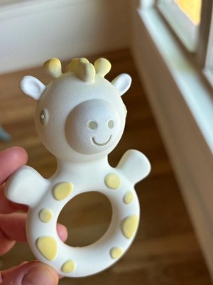 [This review was collected as part of a promotion.] This is a great quality 100% rubber teether. It reminds me of Sophie the Giraffe except that it's smaller and easier to grab. The little things on its head are fun for little hands and mouths to explore, as are the little arms!