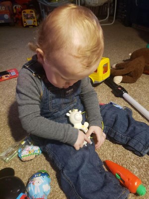This toy came in with zero packaging. It was covered in gray scuff marks and overall filthy. Looks like it was kept in the back of a store on the ground or something. The photos I've provided are what the toy looks like AFTER I scrubbed it in soapy hot water. Still stained and from my standards, ruined. I would not give this to my baby to play with.