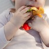 My 6 month old loves this teether! The shape is perfect for his little hands to hold and he enjoys exploring the different textures. It’s so cute I bought a second one to give as a gift!