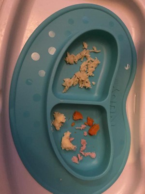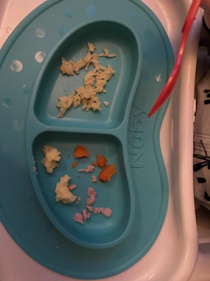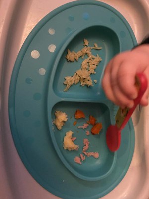 I used this while feeding my daughter and I am really happy with the material and the adhesion to the table. I found the compartments to be a bit deep for my daughter now, but that won't be an issue as she gets bigger. The overall size of the plate is well-designed to fit our highchair tray, and it cleans very easily. Looking forward to buying more of these in all of the fun colors!
