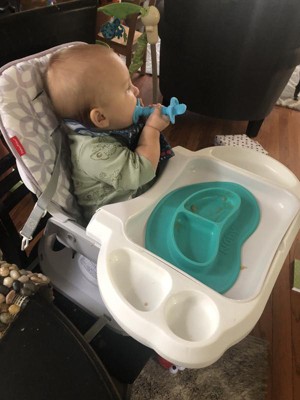 Overall I like this feeding mat. The divided tray is low and easy for my baby to get food from. I liked that I could put two different foods at once. It didn’t fit that well on our high chair due to its shape and it didn’t stick well but that might be due to the poor fit. I would recommend it for high chairs with larger trays or using it on the table directly.