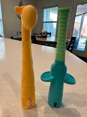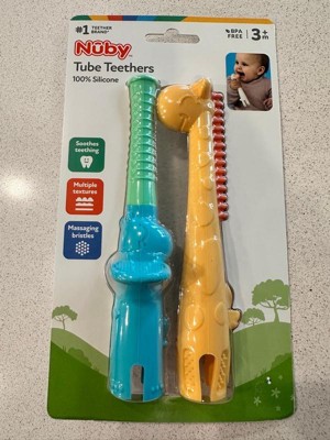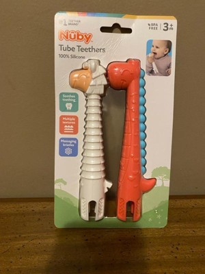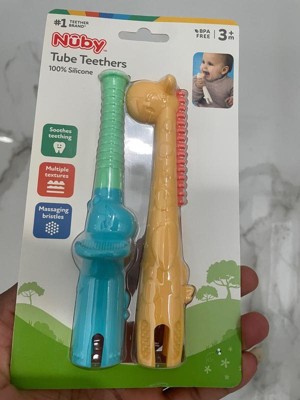 Nuby’s Animal Tube Teethers help make teething easier. The multi-textured surfaces and massaging bristles encourage tactile exploration and stimulate baby's sore gums as they teethe. The Animal Tube Teethers are made of soft, flexible silicone so it provides just the right relief for fussy babies. The tube design helps little ones cut molars and is sized to be easy for little hands to grasp and hold. With quality and durability in mind, Nuby’s Animal Tube Teethers are made from 100% super soft silicone.