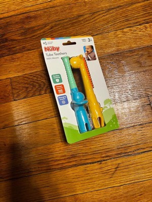 [This review was collected as part of a promotion.] This nuby tube teethers are a great soft toy with cute and eye catching colors the small hands were thrilled with its ez grip and fun characteristics of it. Helps baby’s to calm down when there teething.