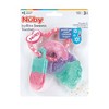 Nuby's IcyBite Sweet Treats Teething Toy is the cool way to soothe teething pain. This clever cooling teether uses purICE gel to help soothe tender gums. The teether's purICE gel filling stays cooler longer than water-filled teethers, providing extended relief for sensitive gums. Pop the IcyBite teether in the fridge to chill out, then let your little one nibble their way to teething relief. For additional soothing, the teether's multi-textured surfaces massage and stimulate baby's sore gums. The keyring design is easy for little hands to grasp and hold, which supports tactile development. The IcyBite Sweets Nuby teether features bright colors to draw little eyes and keep baby's attention. With quality and durability in mind, this baby teething toy is made to last and meets or exceeds all government safety regulations.