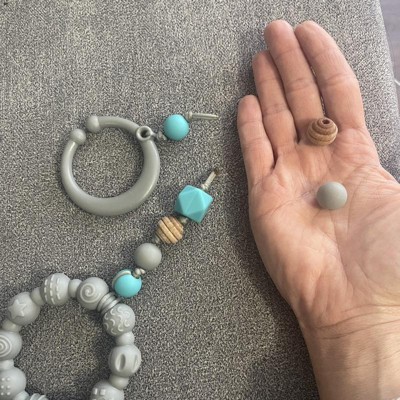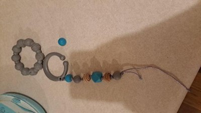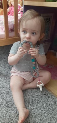 This was a great teether until it broke. Both strings snapped so that one of the teal balls came off. Luckily I was wearing my child at the time and noticed it right away. Definitely a choking hazard and because of this, I wouldn’t recommend it.