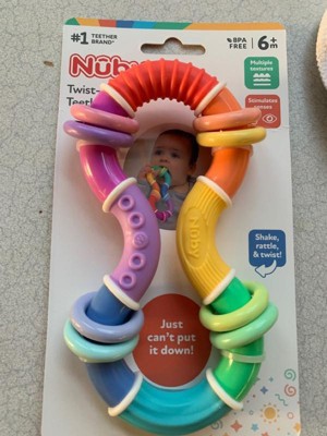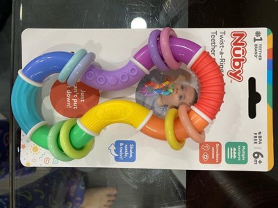 Shake things up with Nuby’s Twista Rattle Teether! The Twista Rattle Teether tames those teething blues while engaging baby’s fine motor skills. Featuring bright colors and fun sounds, the Twista Rattle Teether stimulates baby’s senses, helping develop dexterity and hand-eye coordination while hard and soft surfaces encourage tactile exploration. Fun and flexible, the teether’s textured surfaces provide relief during tough teething times and are easy for baby to grasp and hold. The Twista Rattle Teether will be sure to delight little ones at every twist and turn. With quality and durability in mind, the Twista Rattle Teether is made with sturdy materials.