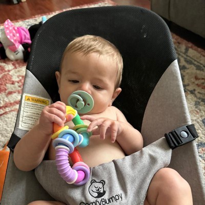 I really like how colorful this toy is, how it twists, and has moving rings. Unfortunately my teething daughter is not a big fan of this toy because she finds it difficult to chew on. I usually end up having to take it away because she ends up upset or throws the toy. I have tried twisting it to different positions, and offering her different spots to chew on, but she just isn’t a big fan. This may be something she enjoys when she gets a little bigger because right now she is only 5 months old.