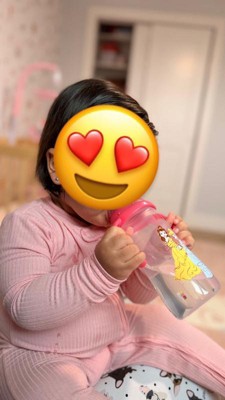[This review was collected as part of a promotion.] My 10 mo loves the cup for drinking water. What draws her in is the drawing of princesses. I use it on the go especially for hot days she can grab it from the holder and give herself water when I’m driving. It’s very easy to assemble as well as clean. I would say though that when she drinks about the material from the sippy does sink in. It does not stop her from drinking it but does make it a bit more challenging. As you can see I was attempting to take a picture while she was trying to take it away from my hand.
