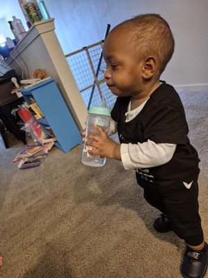 [This review was collected as part of a promotion.] I like this cup for my 18 month old for his last bottle before bed. He does well with straws but can’t get all the milk out so this is a wonderful solution. He can hold it on its own. Only problem is getting the lid off sometimes because of the handle that he can hold also being able to twist
