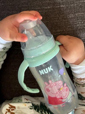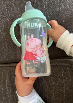 [This review was collected as part of a promotion.] Another win for Nuk with this Peppa Pig 10oz Cup! My baby loves Peppa, and this cup has the sweetest image of Peppa and George hugging in pastel colors! I have a smaller Nuk cup I bought for short outings, and this larger cup with handles and a secure lid has been the perfect upgrade! It fits in my diaper bag, I've had no trouble with leaks, I can easily add ice to it on a hot day, and the price point makes it a 'no fuss' cup. One drawback is that ice holds only as long as any standard plastic cup, and condensation does occur, so this would not be great for longer outings. Also, the spout is rubbery and my baby likes to invert it and then come to me for help repeatedly. I believe she sees it as more of a bonding game for us! Cleaning is simple, and the adorable Peppa image hasn't worn off after multiple washes (I do not dishwash my cup, although I have dishwashed my other Nuk and have had no problem with the image quality). All in all, its a pretty plastic cup if your child is a Peppa Pig fan!