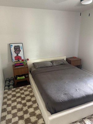 [This review was collected as part of a promotion.] Fun, modern checkerboard rug available in so many sizes. Went 6’ round for a very square nursery. Rug is all poly and very soft, however it did have a strong chemical odor at first. Aired outdoors over our deck chairs for a few days. The length of the shag is substantial, haven’t attempted vacuuming yet. The cream and beige is neutral and very easy to work with. Rugs USA had the best price around!