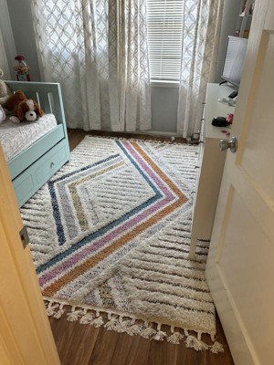 Both children and adults alike are bound to fall in love with this beautiful cozy textured area rug. Not lacking a single detail this rug features a fun creative pattern, bright pops of color, and braided tassels. It will make the perfect addition to a playroom, nursery, or bedroom. Prized for their durability and ease of care, synthetic rugs are the perfect choice when spills and constant foot traffic are at the top of your mind.