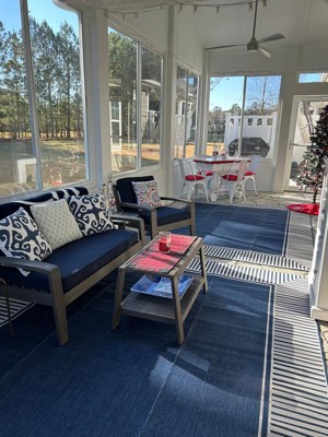 Whoever said beautiful floor accents are only for inside the home hasn’t yet met an indoor/outdoor area rug. This casual rug will warm up any space with its simple yet beautiful striped border. Made from durable fibers that are perfect for any high traffic areas and will last for years to come. Kick back and relax with our easy to care for and pet-friendly area rugs.