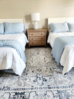 [This review was collected as part of a promotion.] This rug is very pretty. Came fairly fast, easy to unwrap and wasn’t wrinkled much at all- definitely a plus. My only small issue is the color. It’s slightly darker blue than it looks in any of the photos. There’s still light blue and a grayish color present, but absolutely more navy blue than expected. Not sure my photos really show that, it’s clearer in person.