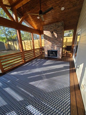 [This review was collected as part of a promotion.] We needed a large outdoor rug to cover a large portion of our outdoor patio. This rug looks and feels perfect under our feet. Added bonus, the dogs love taking afternoon naps on it!