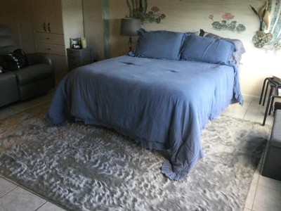 [This review was collected as part of a promotion.] Long soft shag in a pretty Bue-grey hue. A little bit of shedding the first week. My daughter loves it.