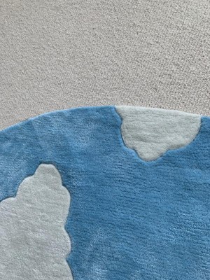 We love this beautiful rug that features white fluffy clouds on a sky blue background. The colors are true to the online photos. The rug is a soft cut pile. We have the 5x5 round. It so happens that we have a children's comforter with the exact same pattern, so this was a must have!