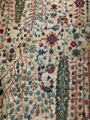 A: Thank you for your inquiry. With the tan/natural base, the colors within this rugs design are; olive, yellow, blue, burgundy, peach, and off-white.