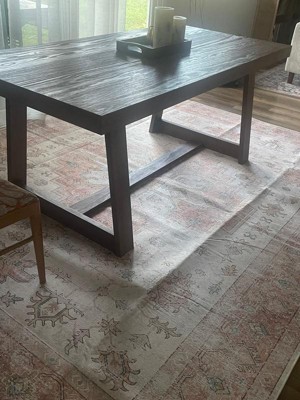 [This review was collected as part of a promotion.] This rug is absolutely gorgeous. Very elegant looking. I’ve not had one of these kind of rugs before, but it’s perfect for under the dining table. You don't t have to worry about spills. Ive have purchased several rugs from rugs USA and always been happy. I’ve noticed these washable rugs are everywhere. In my opinion this rug looks nicer than some of the other washable rugs out there. I have another one that is kind of that printed pattern on a woven mat and I think this actually looks nicer than that. This is also a printed rug, but it’s really pretty. There’s peach, dusty rose, brown, kind of a taupe m, and a sky blue which reads a little turquoise to me and really is prominent. Terra cotta too. It’s beautiful. There were no reviews when I bought this so I hope this helps. For the price, it can’t be beat. I bought the 8x10 on sale.