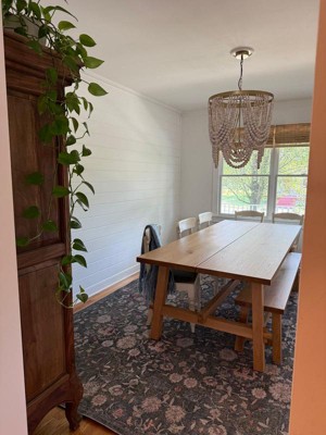 [This review was collected as part of a promotion.] I LOVE this rug. It came out of the box and laid flat right away. Perfect for a dining room since it’s low/no pile. Beautiful colors-doesn’t look very green, but I love it.