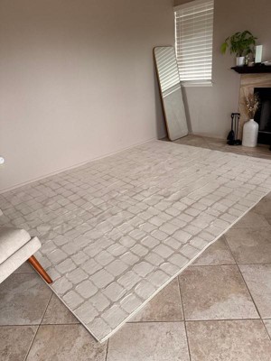 • A: The rug showcases a stylish checkered pattern, adding a modern touch to any room.