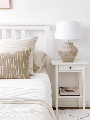 Bring a touch of transitional charm to your living room, study, or bedroom with this table lamp featuring a ceramic round base and empire shade. The fabric shade lets you create a warm and cozy ambience. A rug pad is recommended to prevent slipping and to keep the rug lying flat in one place